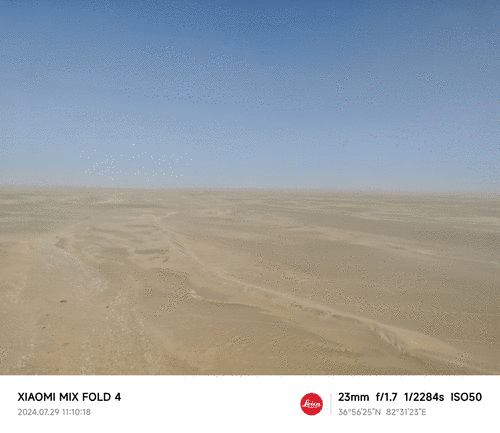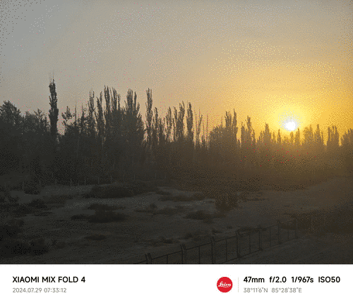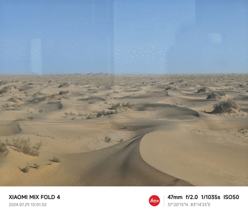 列车从若羌站起换向向西驶入前往和田的若和线,而我也又一次沉沉睡去。再次醒来时已近7点,天空已经亮起,一轮红日也出现在地平线上。若和线整体沿塔克拉玛干南缘修建,有600余公里路段深入沙漠。因此,除了途径的民丰、南屯等10个车站,窗外基本上都是茫茫无际的一片沙海。当然,得益于近年来的防风固沙工程,沙漠中也并非是一成不变的景色。沿途的绝大多数地方都有固沙方格,应该是为了防止风沙侵蚀路基所设。更令人欣喜的是沙漠中的一点绿色,有成片的梭梭林分布于铁路两侧,也有被称为“沙漠守护神”的胡杨点缀其中,在接近县城或是兵团团场的地方,更有连片的树林保护着沙漠中的聚居地。相比而言,纯粹的沙丘景象反而成了少数。