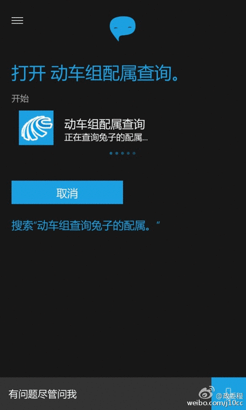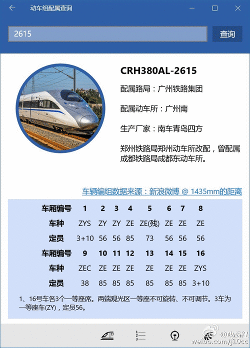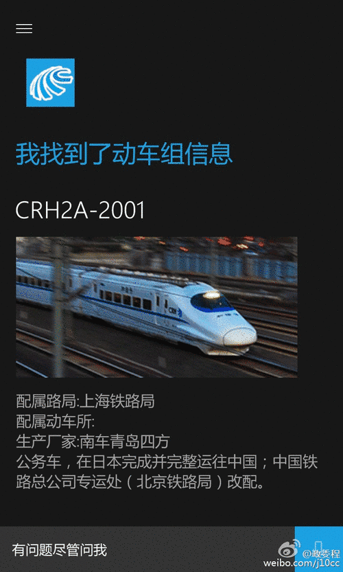 动车组配属查询Win10版3.0.23已经上线。本版本增加车辆编组信息查询,感谢@1435mm的距离 提供的编组信息。支持简体中文,繁体中文,英文,日文四种语言。可通过Cortana语音查询信息,支持车迷常用短语。如可以说“查询带鱼的配属”,“查询动局的动车组”等。欢迎各位车迷使用和反馈意见。